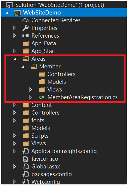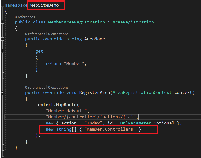 接著更新MemberAreaRegistration.cs 的namaspace,使其與WebSiteDemo專案一致五、測試