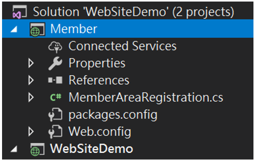 在方案底下,新增一個空的 Web 專案 (Member) ,專案的路徑指向 WebSiteDemo\Area\Member然後將先前另存的MemberAreaRegistration.cs複製到Member專案中,並且在Nuget中安裝Microsoft.AspNet.Mvc。目前為止的Member專案呈現的模樣如下: