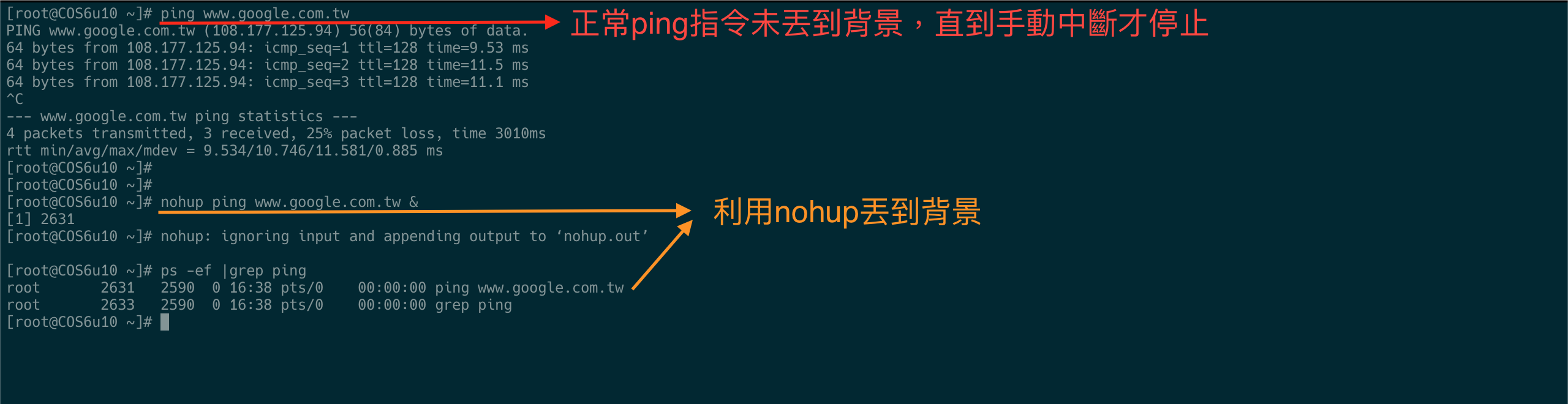 由下圖可見只要在指令前加上nohup ,標準輸出/入就會寫到nohup.out,在指令後加上 & 同時將指令放入背景運作。