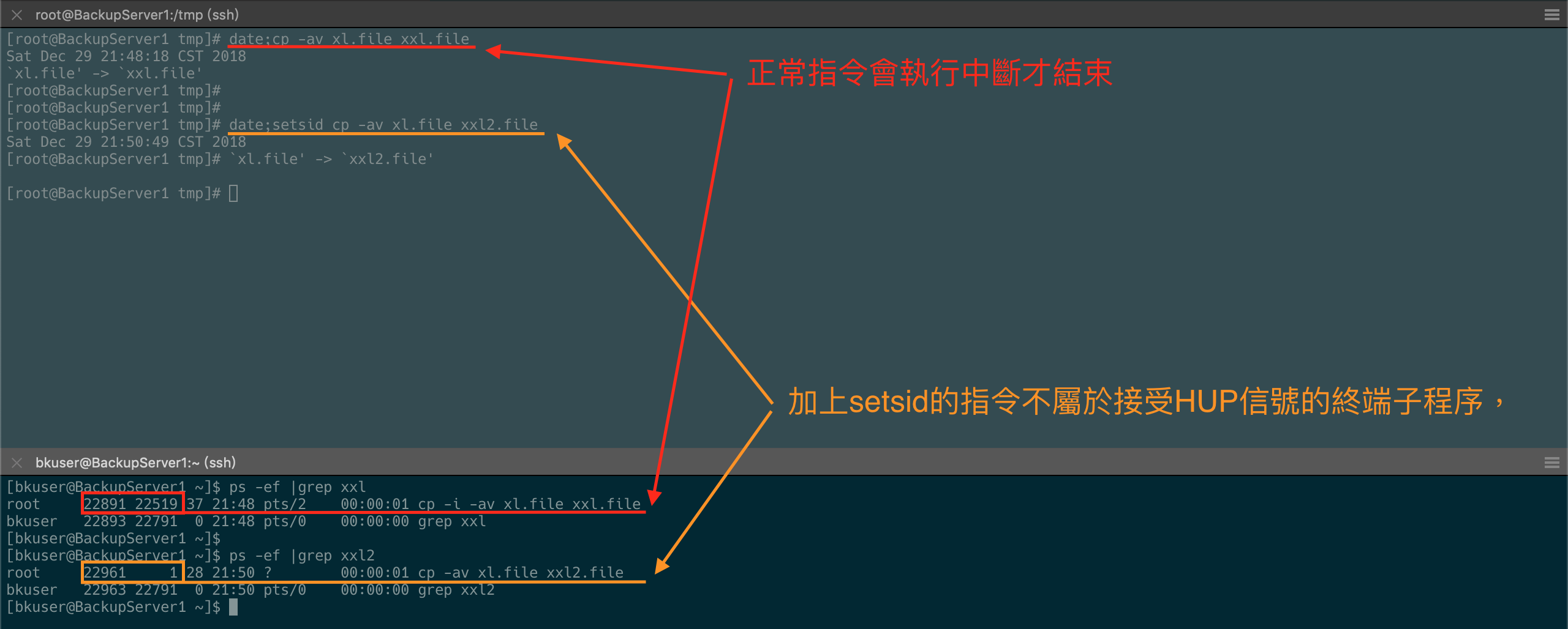 由下圖可見只要將setsid放在指令前,即可,還比nohup簡單。