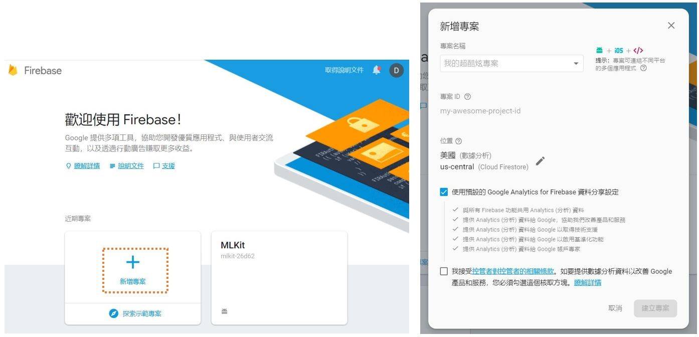 至Firebase 控制台並登入Google帳戶,完成登入後會看到如下歡迎畫面,如是初次登入,請點擊「新增專案」並為專案命名,如已經有專案,可以直接點選專案進入。