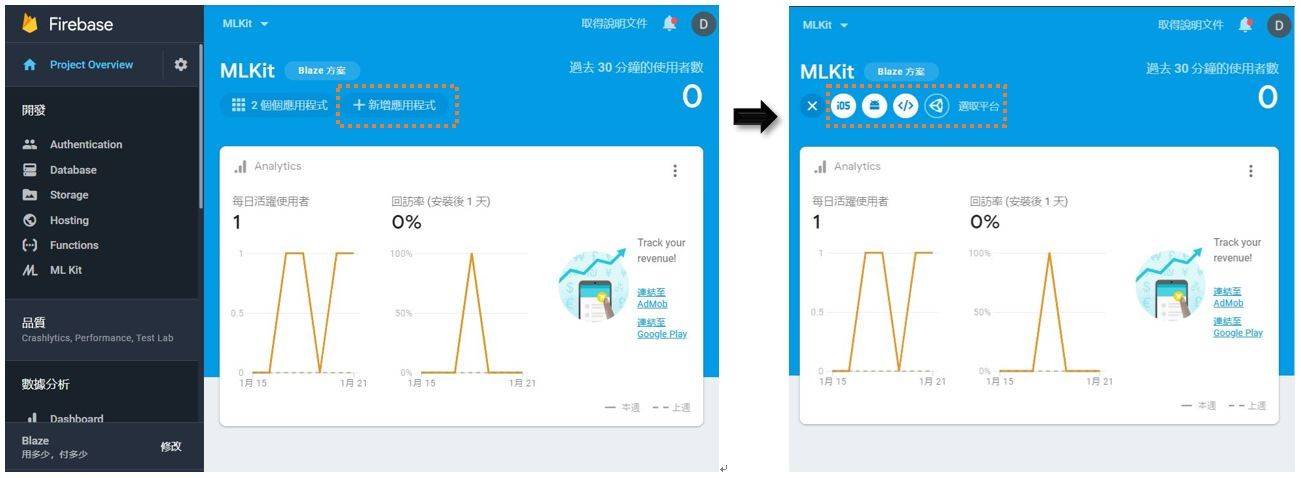 開啟新增的專案及點擊「新增應用程式」,並選取適用平台 (本專案選擇Android)。