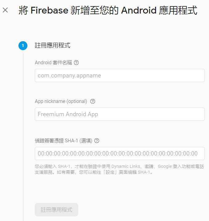 依序填入Android套件名稱、應用程式暱稱(選填)、偵錯簽署憑證SHA-1(選填, 取得方式請點我 )。