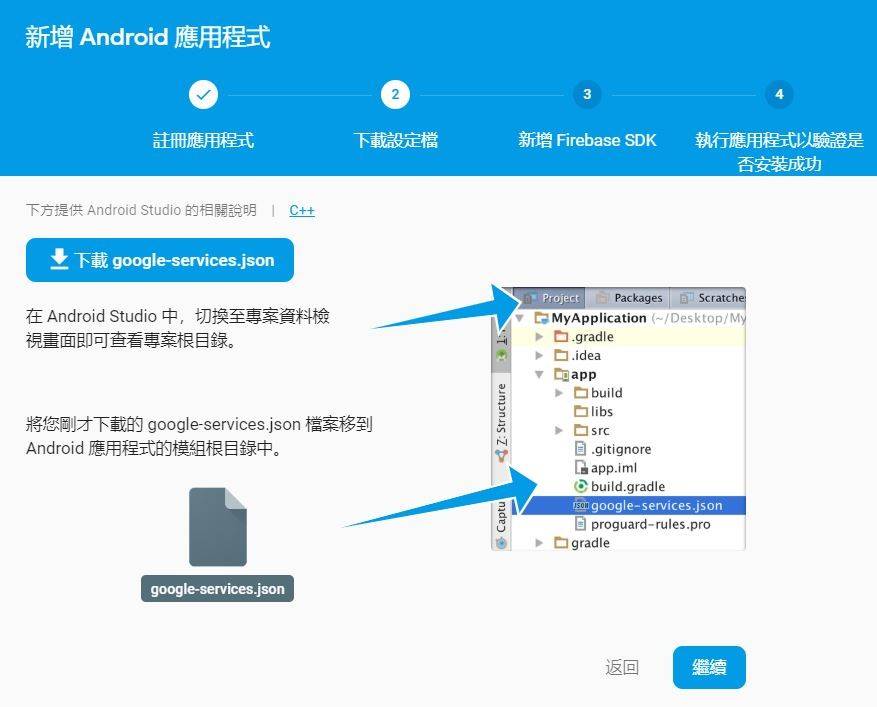 點擊「下載google-services.json」, 並依說明將檔案加入應用程式的模組根目錄中。