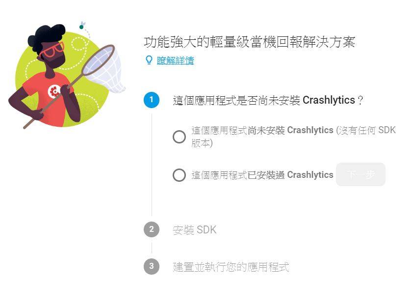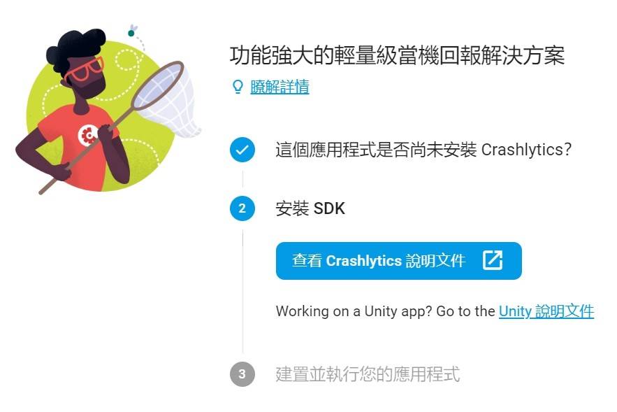 點選主控台左側的Crashlytics,如未設定過,可點選「開始設定Crashlytics」,右側按照步驟操作,最後3個步驟都需打勾才算完成。