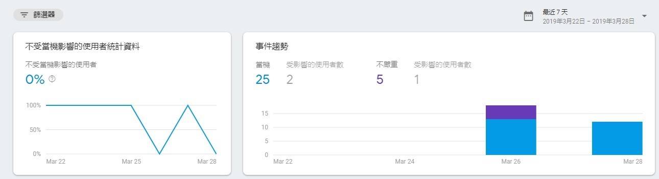 1-1 主控台左上方區塊:顯示「不受當機影響的使用者統計資訊」,橫軸依日期排序,縱軸為百分比,可供衡量那些版本的穩定性得到了提高,其中要特別留意「使用者指的是device數量」。