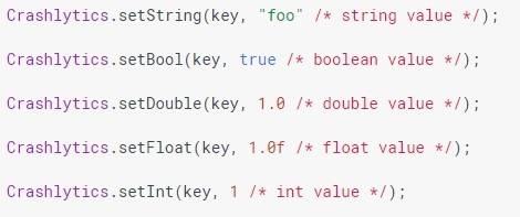 1-3-1 添加自定義金鑰(key):可協助獲取導致crash的特定狀態,共有五種方法來處理不同的數據類型,依官網說明,Crashlytics最多支持64個鍵/值對,達到此閾值後,不會保存其他值,每個鍵/值對最大可達1 kB。