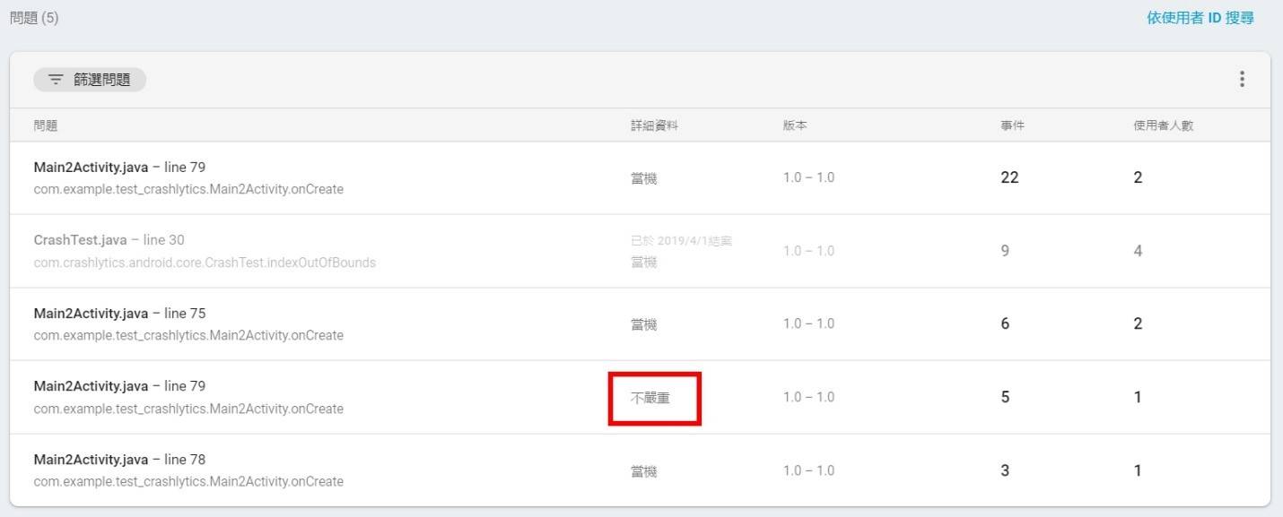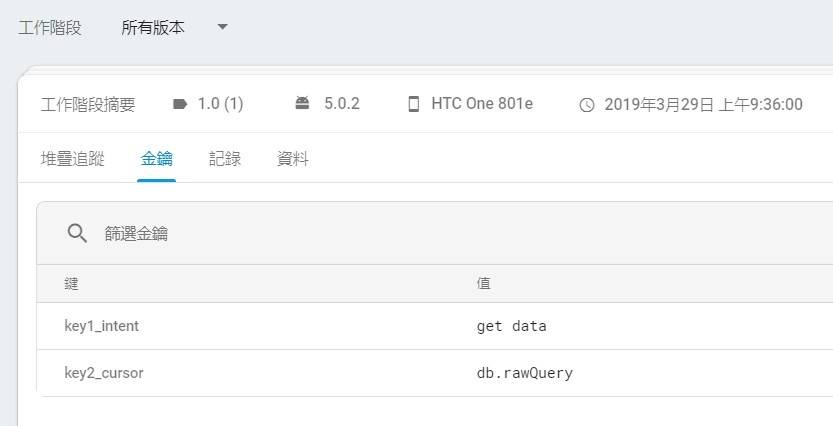 1-3 主控台下方區塊:顯示issue的詳細資料、版本、事件次數、使用者人數(device數量)等資訊,當資料量繁多時,可點選其左上方「篩選問題」功能來縮小範圍並確認問題;此外,點選各issue將另開畫面顯示其詳細內容,如:issue產生次數、各裝置詳細資訊及統計等,也可允許添加自定義金鑰(key)及紀錄(log),此為查找問題的好線索,可以回溯使用者操作步驟,推定有關問題發生的原因。