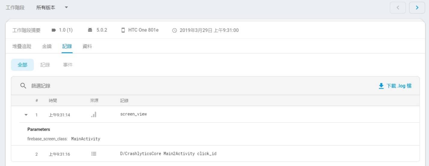 1-3-2 添加自定義紀錄(log):使用log收集使用者在遇到crash前正在執行的操作的詳細訊息,顯示事件的時間表,協助更快作問題確認,依官網說明,為避免減慢app使用,Crashlytics將log限制為64kB,如果超過該限制,將會刪除較舊的log。
