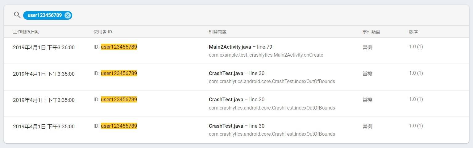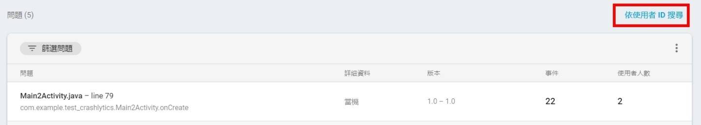 1-3-3 在主控台點選「依使用者ID搜尋」:要診斷問題,瞭解那些使用者遇到那些特定crash通常很有幫助。Crashlytics包含一種 匿名識別使用者的方法如下,如果之後需要清除使用者ID,可將值重置為空字串,但不會刪除現有的Crashlytics記錄。