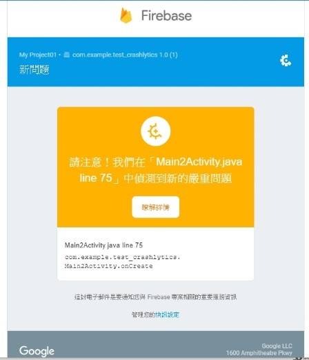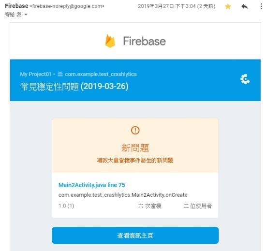 當crash或exception發生時,除了在Firebase主控台會顯示新問題並對其進行優先排序外,在登入Firebase帳號的e-mail信箱也會收到通知信,讓你不會錯過任何的訊息。