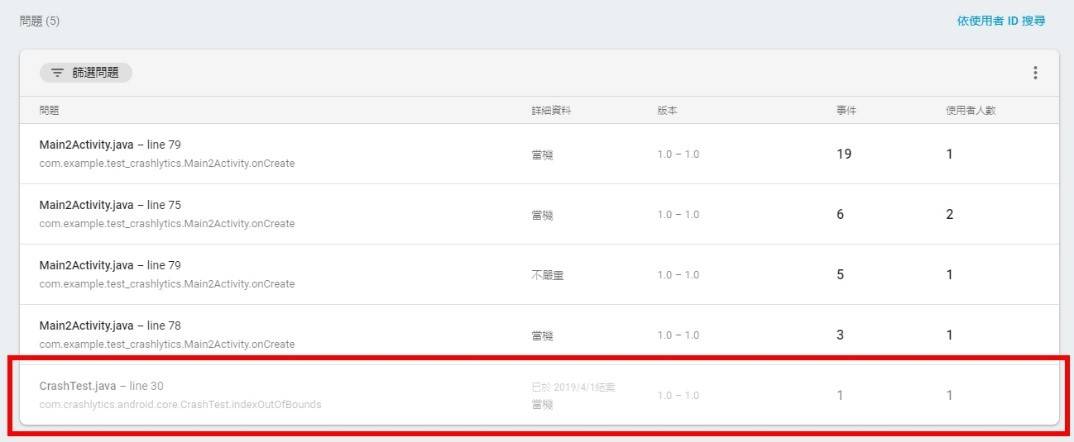 PS:如果一時找不著crash程式碼,也可以使用 Crashlytics.getInstance().crash() 故意發出錯誤訊息測試有沒有建置成功。