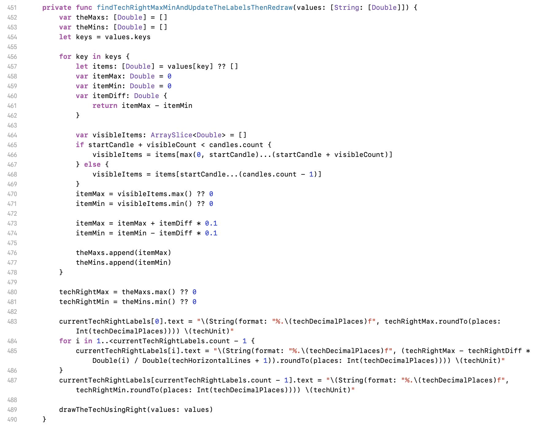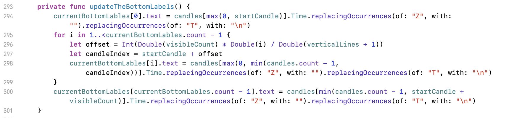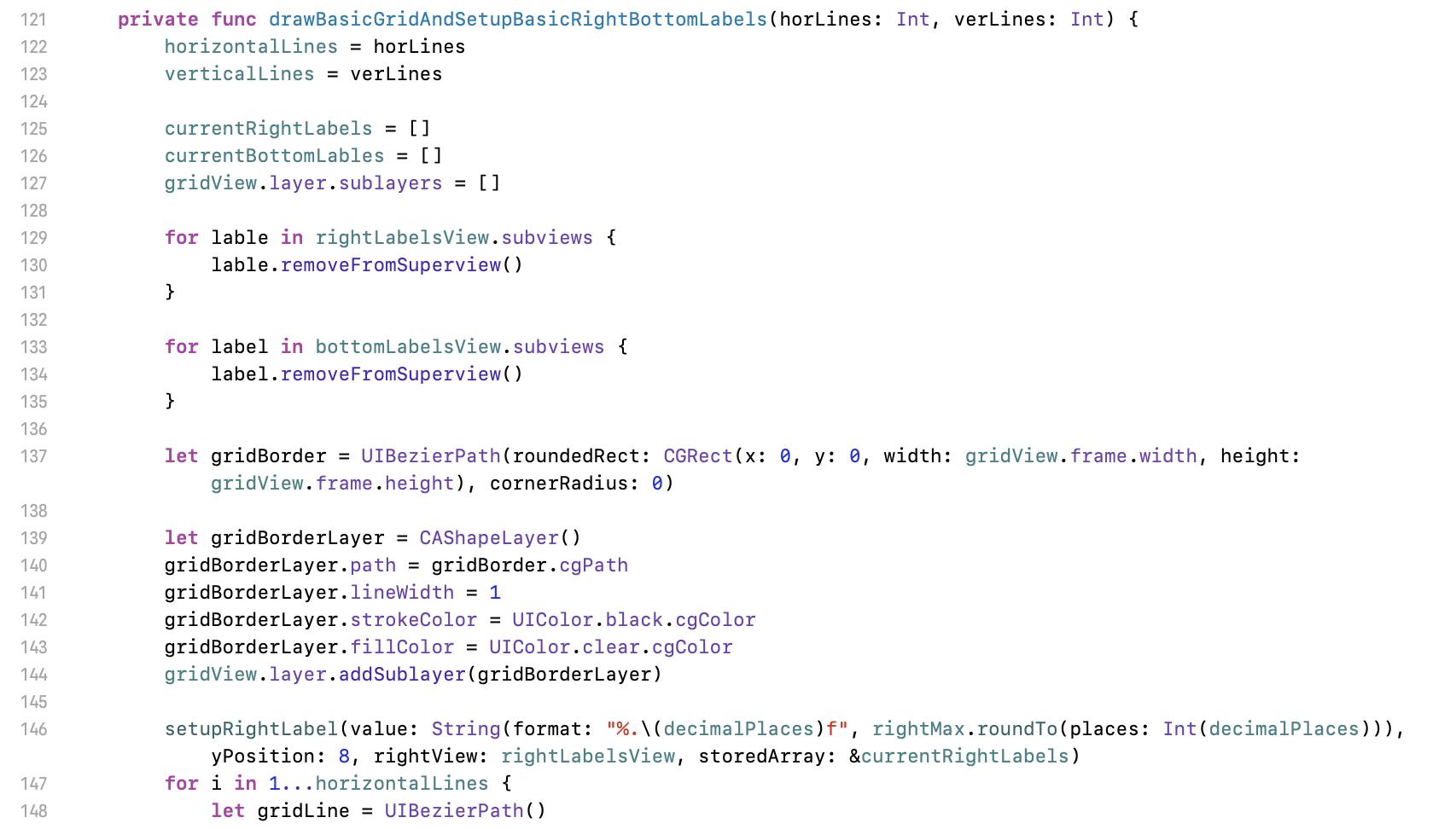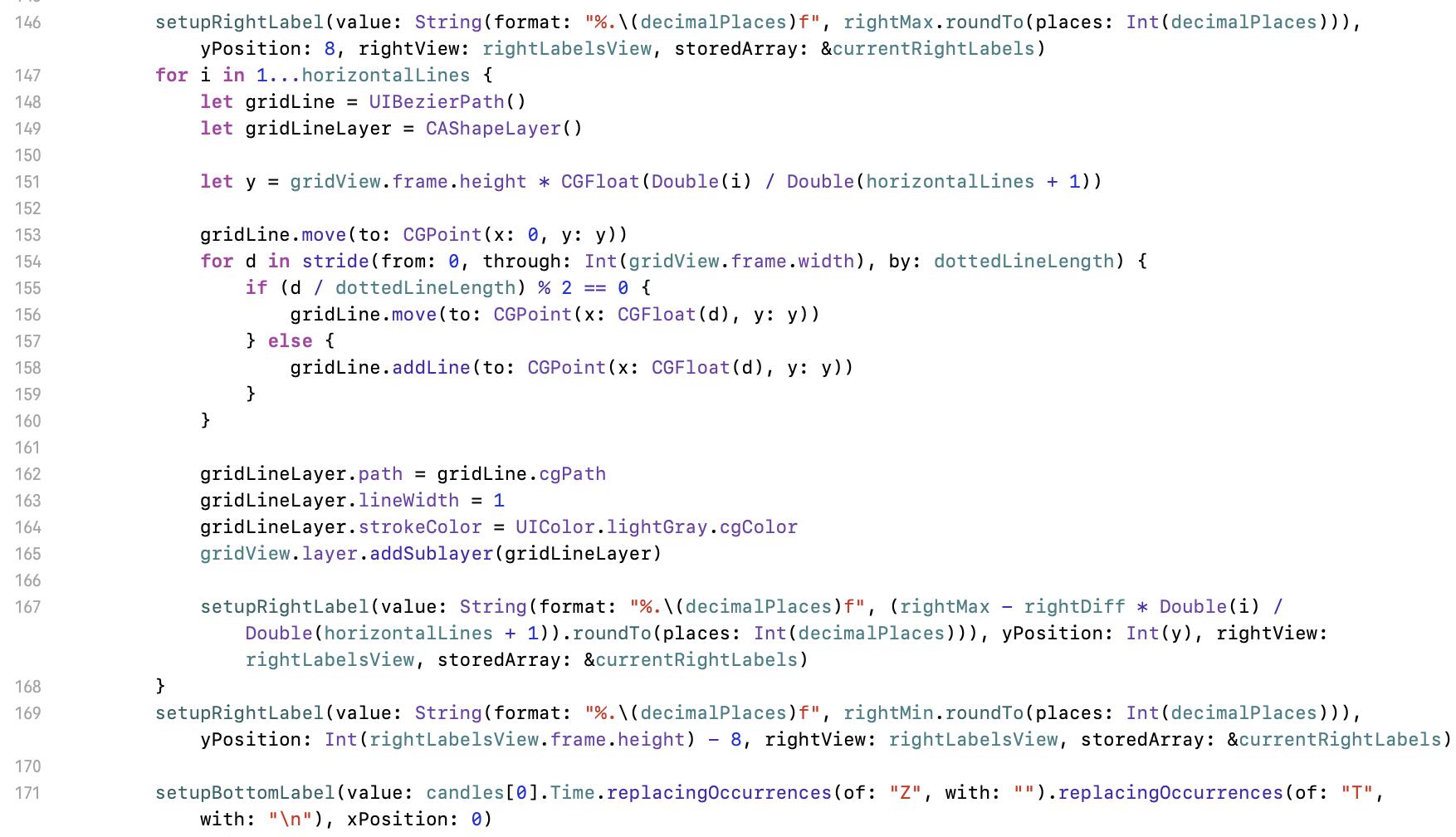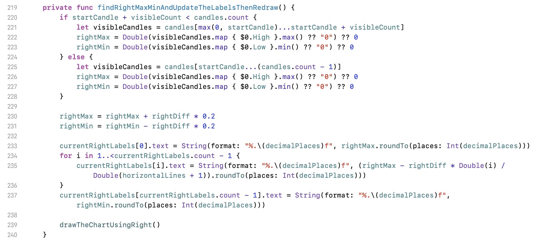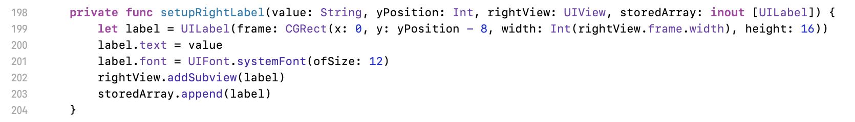 Let we move to line 198 first. Here is an abstracted function for setup right labels. Input parameters are value (value), calculated y position (yPosition), where for the labels (rightView), and the array for labels (storeArray). Modifier inout is for to update the inputed source.