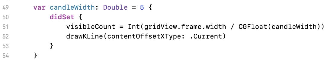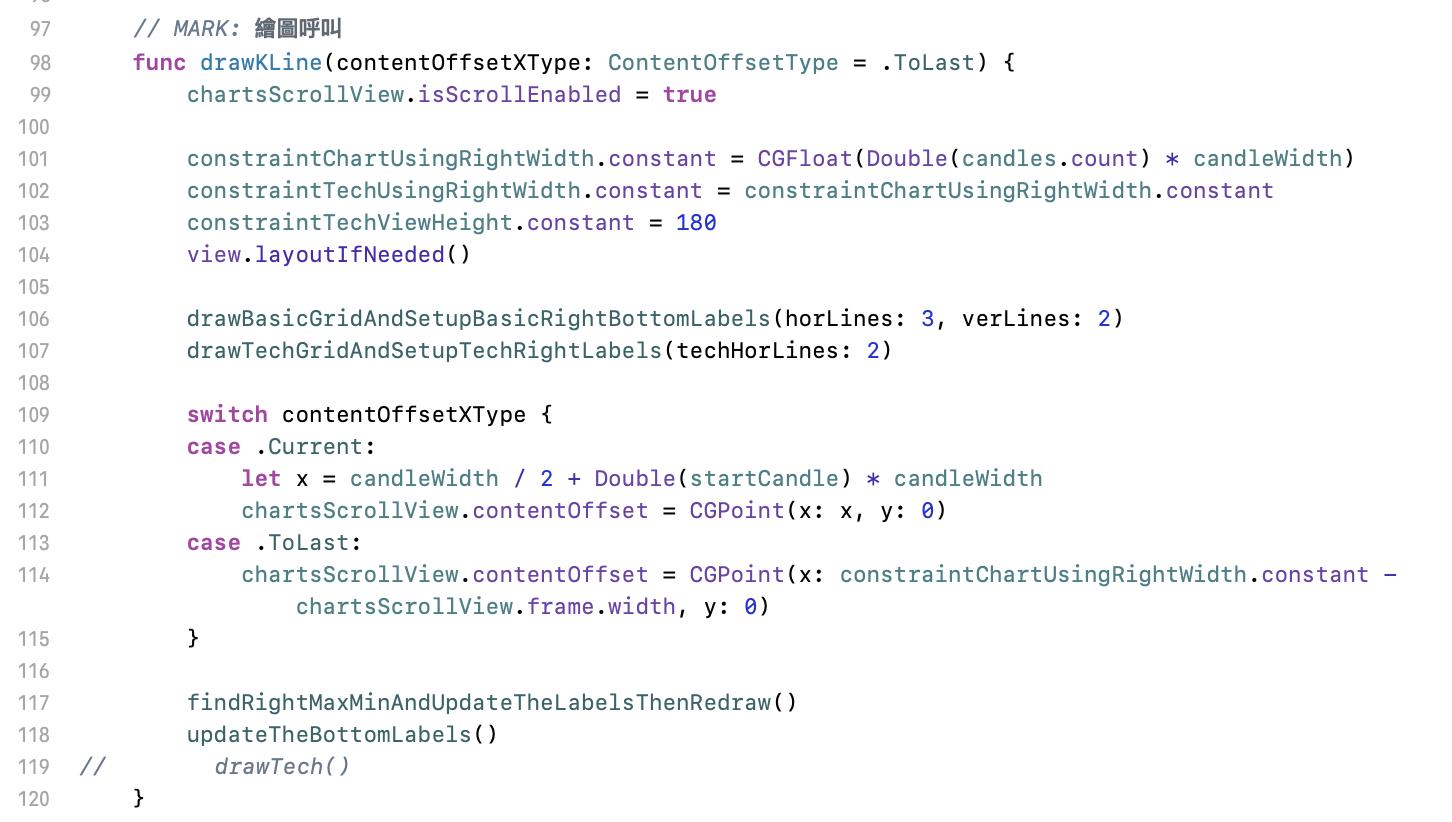 49 行這邊是因應寬度改變後,程式還要做的事:計算可視數量、重繪線圖。這邊的 contentOffsetXType 是避免畫面跑掉的 workaround,應該會有更流暢的作法。