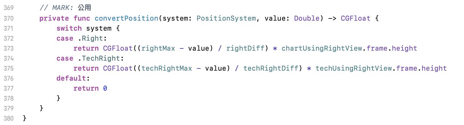 先跳到 198 行抽象化出來的右標籤設置方法。輸入參數為數值(value)、自己算出來的 y 座標位置(yPosition)、這些 Labels 放在哪(rightView)與要操作哪些 Labels 陣列(storeArray)。用 inout 的原因是因為要將操作的結果回存到那堆 Labels 裡。