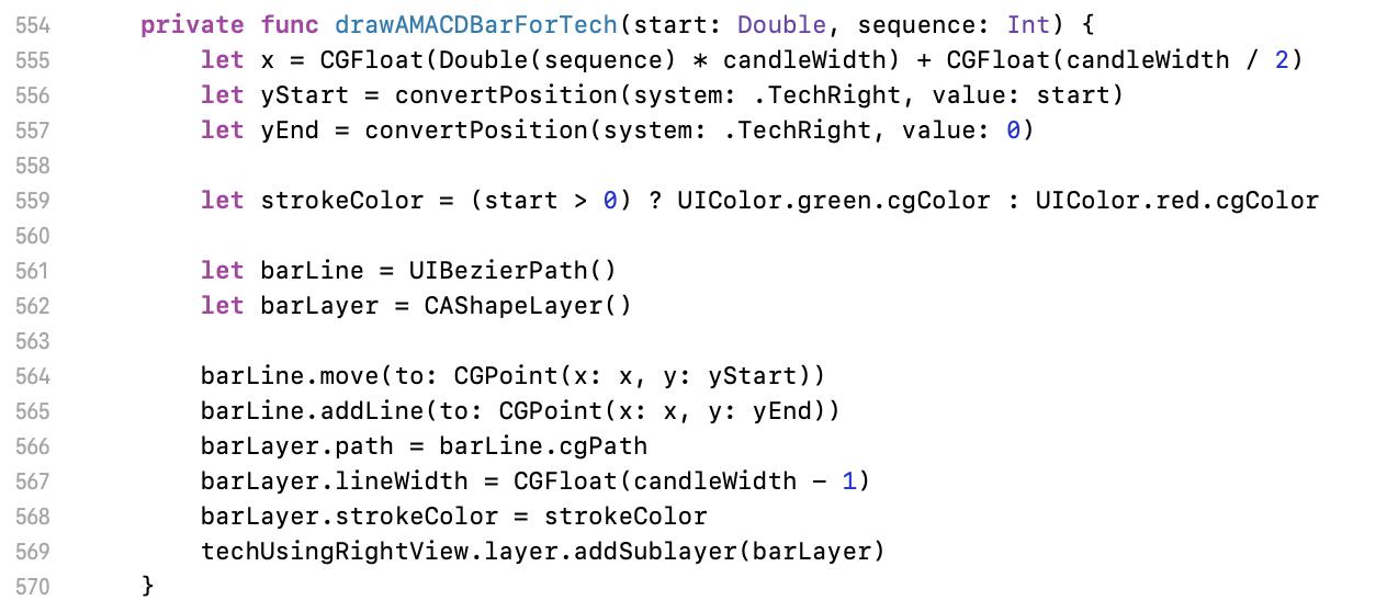 最後補充一下 MACD 柱狀圖。這個圖的結束點都是在 0 的位置,所以獨立出自己的方法。一樣的邏輯,y 的開始與結束值都要丟去座標轉換的方法丟得畫面座標,再於 564 與 565 行將圖畫出。
