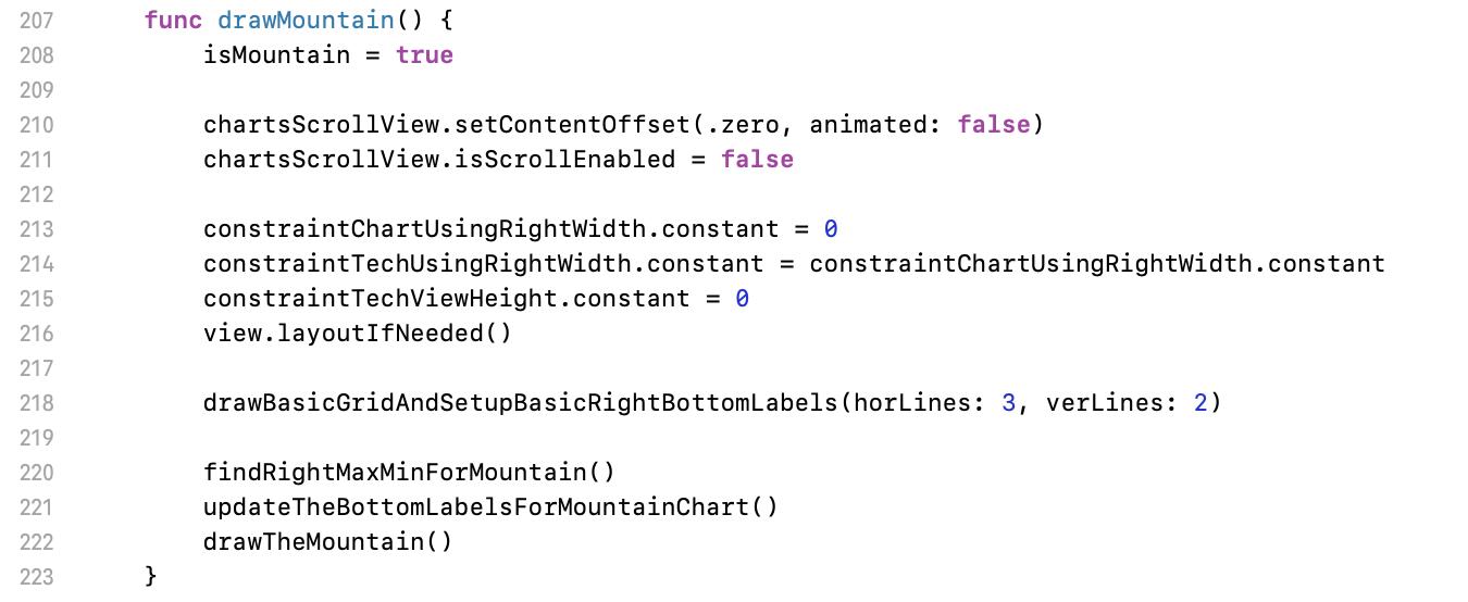 Next part is about mountain chart. This chart is very important for traders, so this is undoubtedly listed in the requirement. Please checkout to commit d8150d3. As the below image, we usually need a full screen mountain chart. In this demo, I just change the value of constraintTechViewHeight 0 to hide the technical indicator. If your autolayout setting are all correct, the screen will automatically perform as you expect.