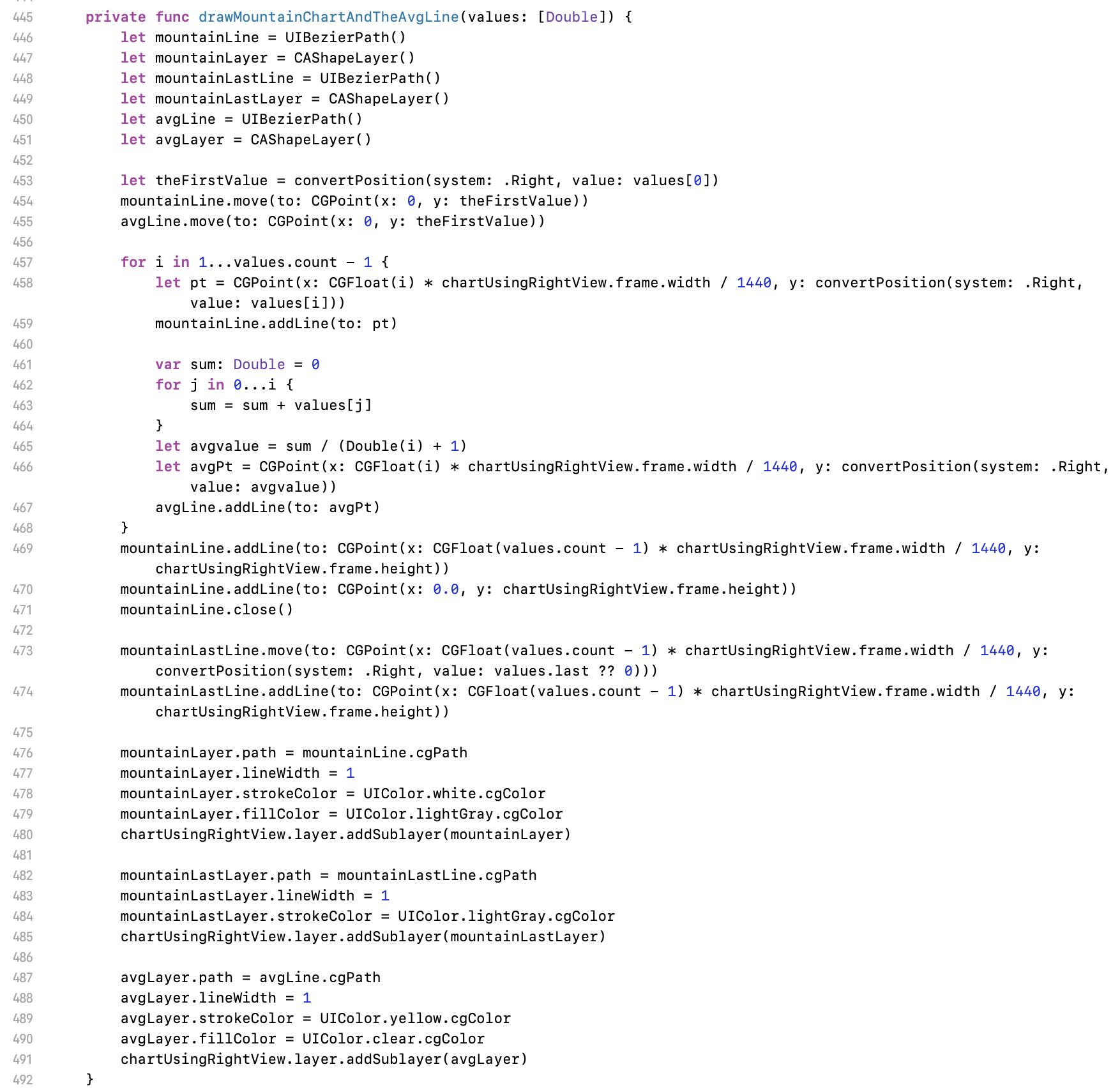 以上就是自繪線圖的基礎知識,也是 iOS 好用的繪圖工具-貝茲曲線的應用之一。總結來說,這跟早期沒有 Interface builder 與 Autolayout 的時代做畫面的邏輯一樣,就是設計一個公式進行手動計算物件的座標而已。只要理解了這個原理,就會知道表面上看起來很難的線圖繪製,根本是件很簡單的事。