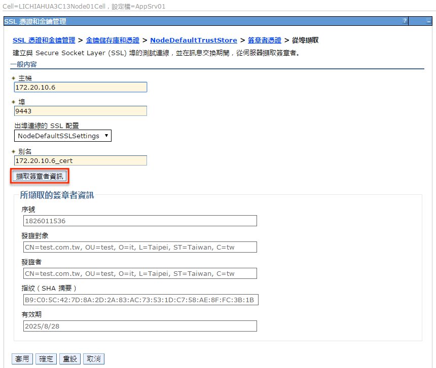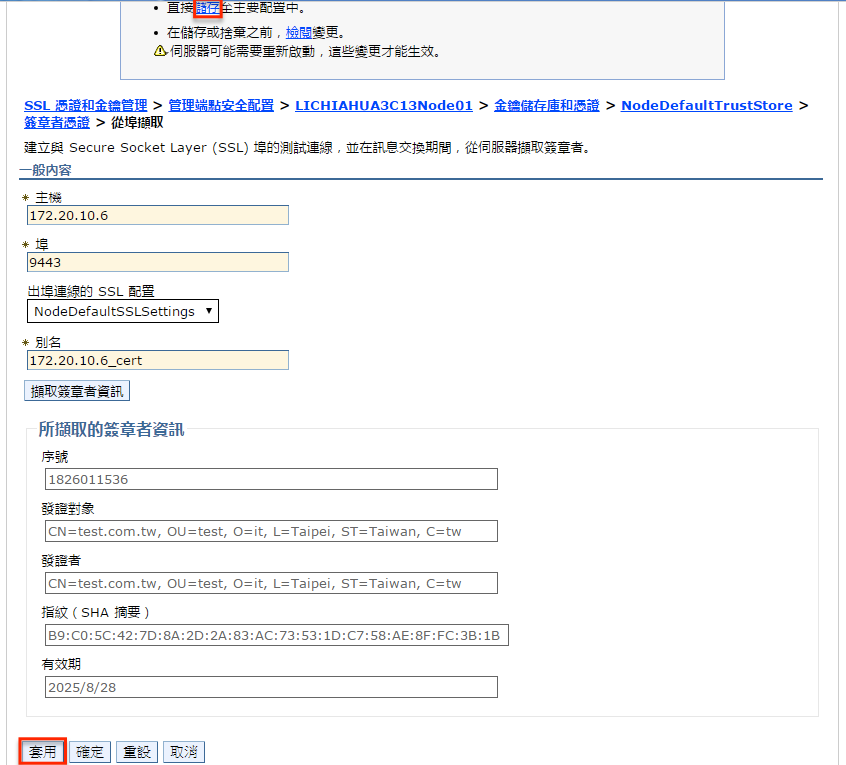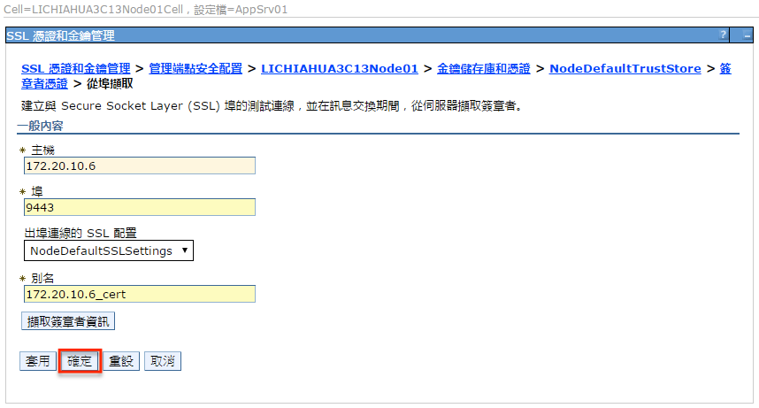 在「主機」欄位中,針對「主機名稱」欄位輸入 172.20.10.6,「埠」欄位輸入 9443,「別名」欄位輸入 172.20.10.6_cert。