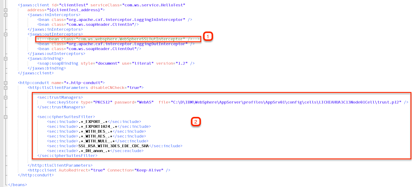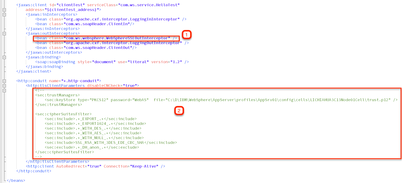 (1)方法一加入的<bean class="com.ws.websphere.WebSphereSSLOutInterceptor" /> 用不到註解掉,或刪除