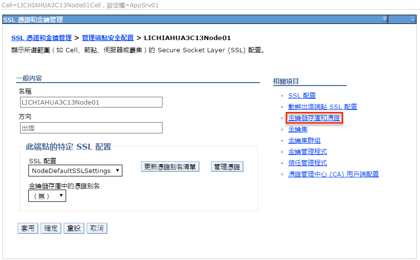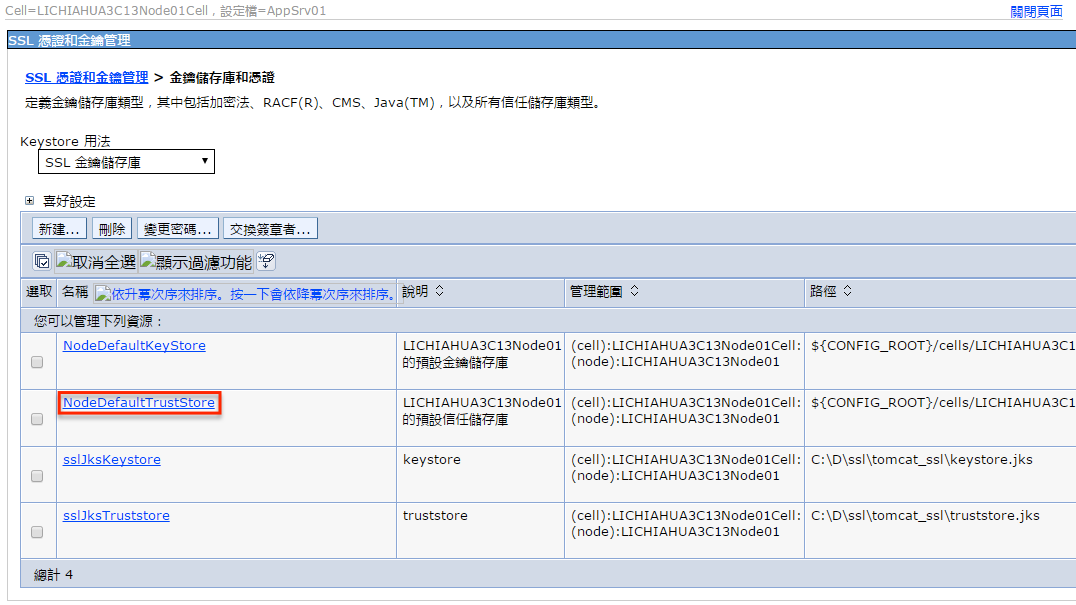 4. 在「相關項目」之下,按一下「金鑰儲存庫和憑證」,再按一下 NodeDefaultTrustStore 金鑰儲