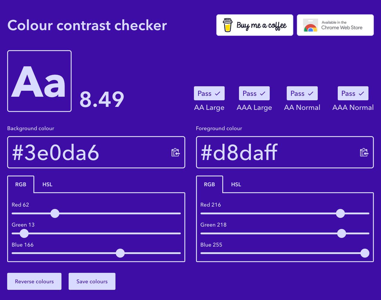 線上有許多檢測工具,透過 Color Contrast Checker 輸入前景色與背景色,就能即時判斷是否達到 WCAG 標準,是快速又實用的工具!我們可以在設計初期就搭配使用,確保字體、按鈕、連結…等元件,在不同的狀態下都清晰可辨識。以下是我整理的四款工具比較: