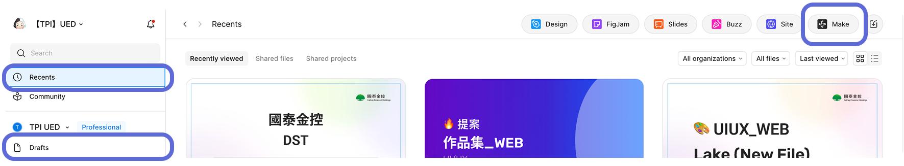 我們可以在 Figma 左側選的 Recents, Drafts 頁籤裡,找到在左上方的 Figma Make。