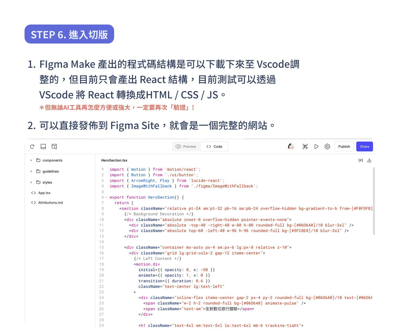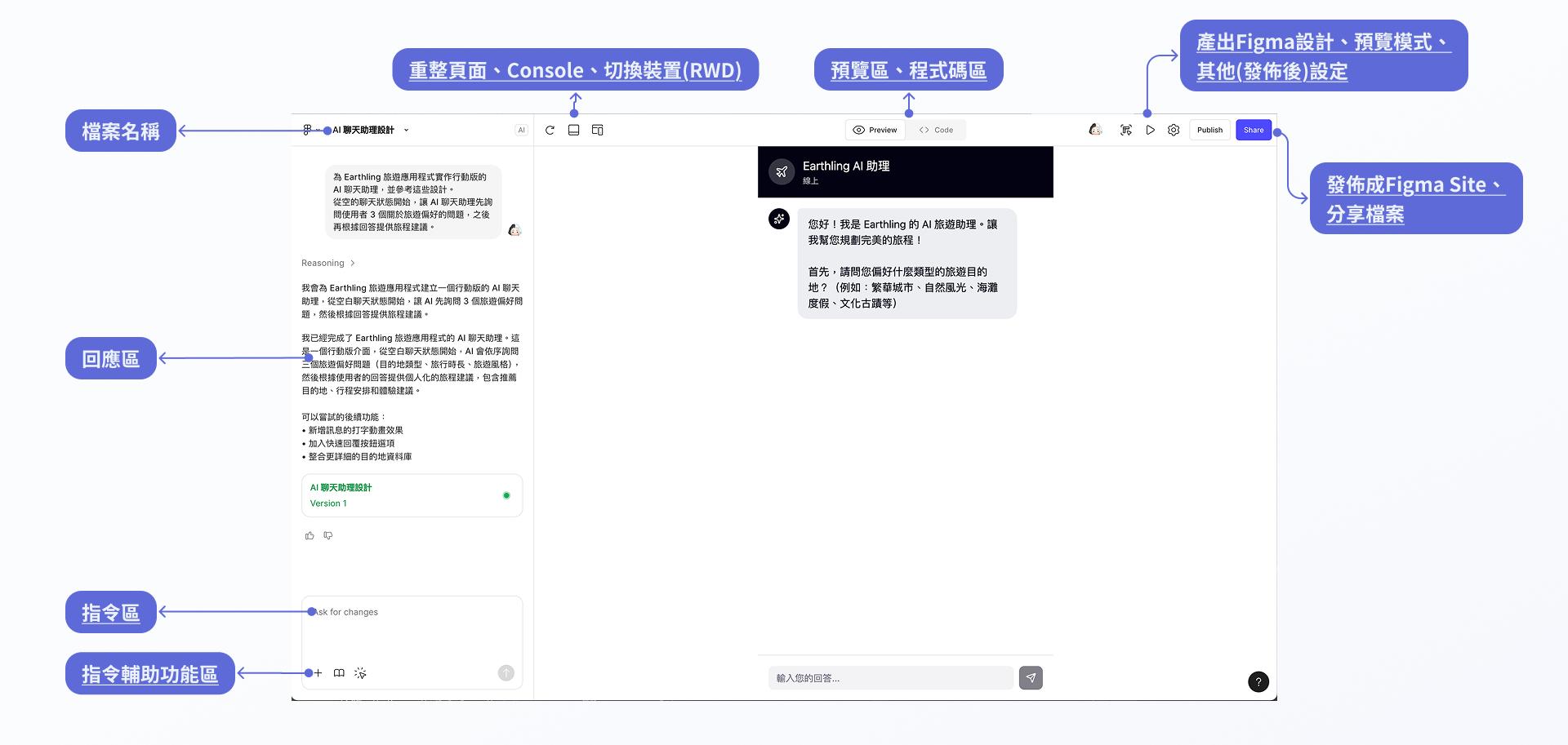 程式碼區: Figma Make 提供可編輯的 React, HTML, CSS 程式碼結構,方便前端工程師後續串接。