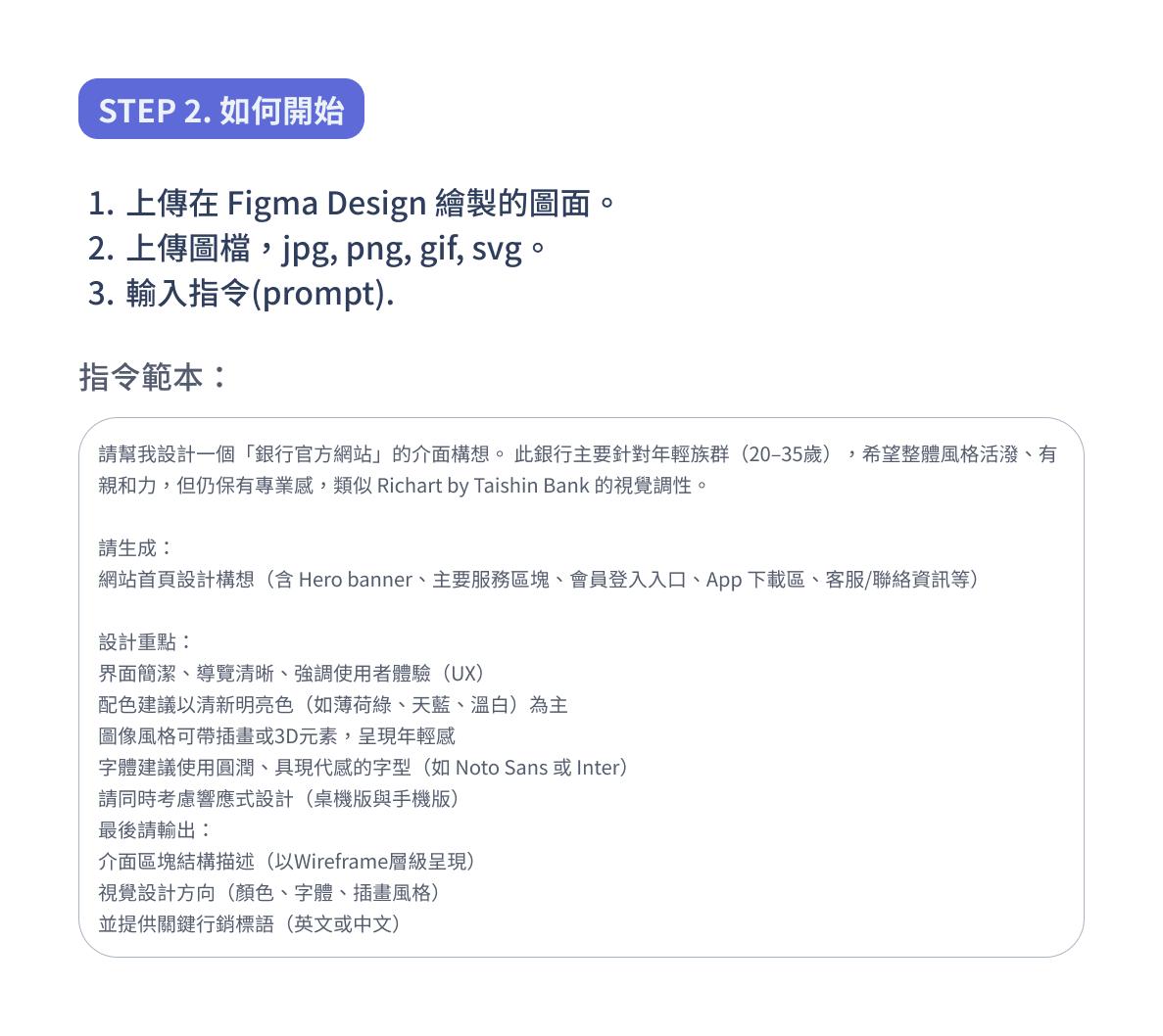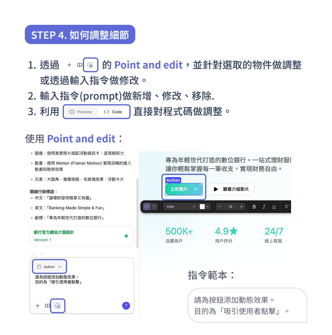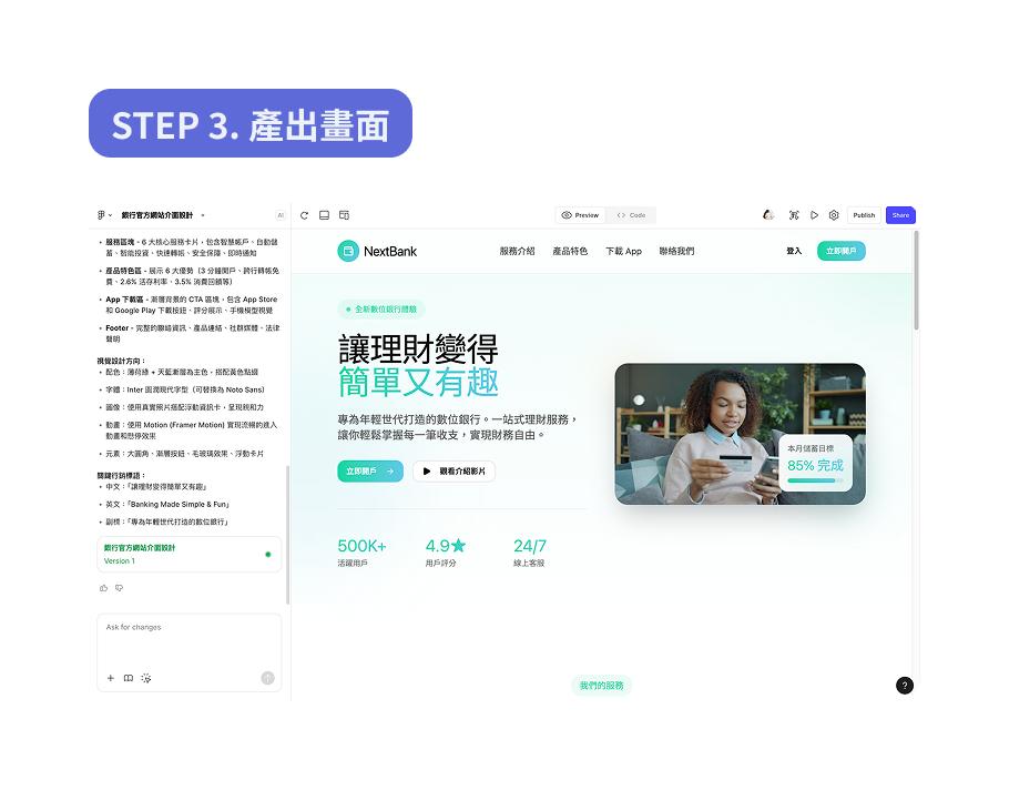 在此指令區清楚描述設計需求,且支援自然語言(中/英文),可以多次修改內容。指令內容描述得越清楚,產出的結果越精細。