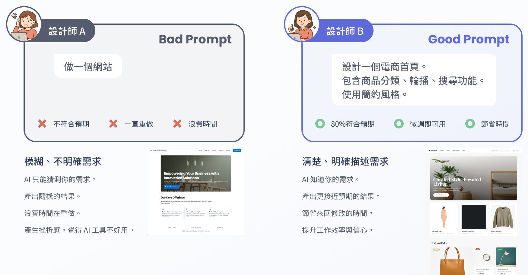 從上面這張圖我們可以看到,當我們給 AI 不明確的指令時,AI 雖然還是能產出結果,但內容可能和需求天差地遠,且需要花很多時間修正 AI 的產出。但若給予 AI 工具明確的指令時,AI 產出的結果就會大概有70~80符合你的預期,之後再針對細節像是色碼、圓角尺寸、字型等進行微調即可,就能提升我們的工作效率。
