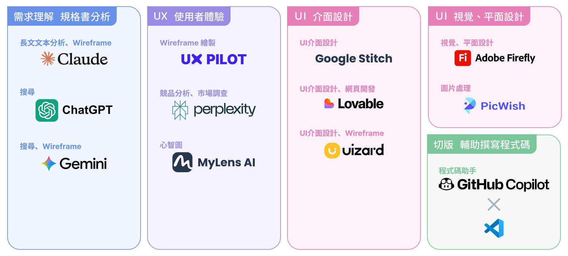 接下來要介紹的是其他工作流程上可能可以用到的工具們,但因為現在AI工具真的非常多,先選擇能與我們平常熟悉的工具(Figma, Adobe, Google, VS code)一起協作的工具,稍後要介紹的是我玩到覺得很不錯的工具們。