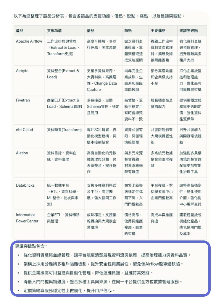 指令範本:請你依照關鍵字進行競品分析,請簡單扼要整理成表格讓我知道各自能做什麼?優點,缺點,找出痛點,並建議我們能從哪裡突破。