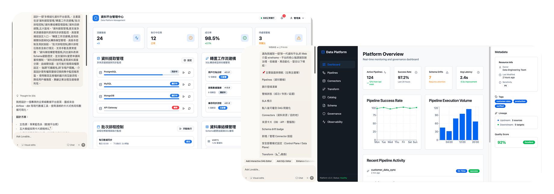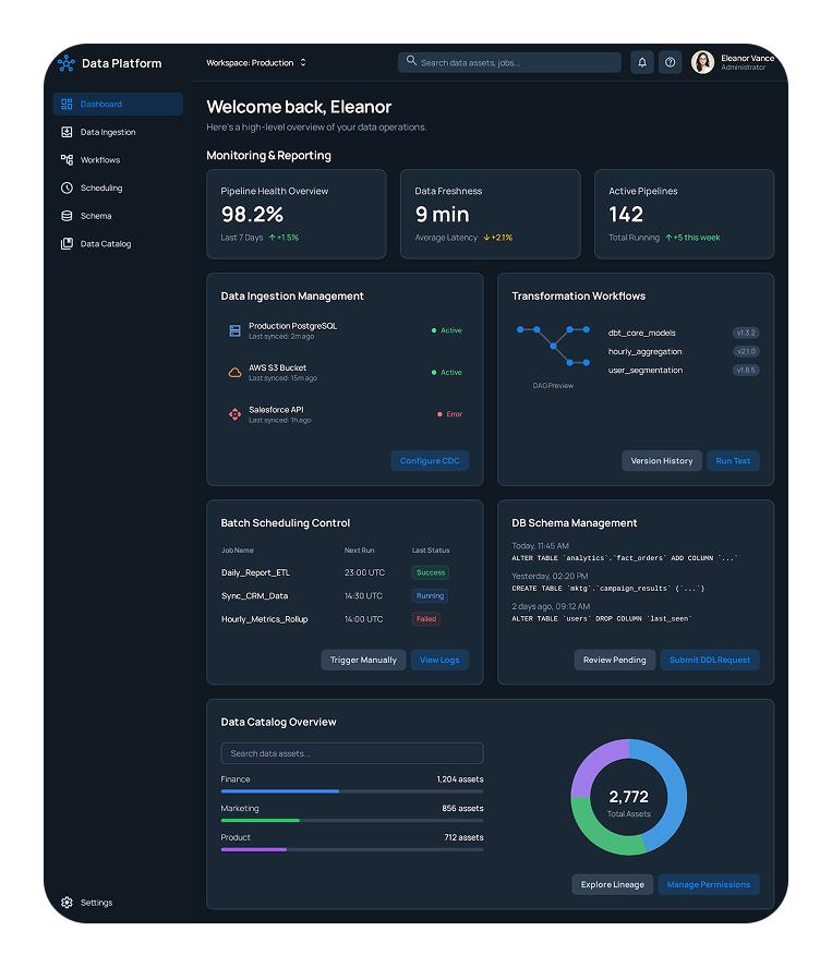1. 設計一個「多模組化資料平台首頁」,主畫面包含「資料提取管理」「轉置工作流建構」「批次排程控制」「資料庫結構管理面板」「資料目錄總覽」五大區域。