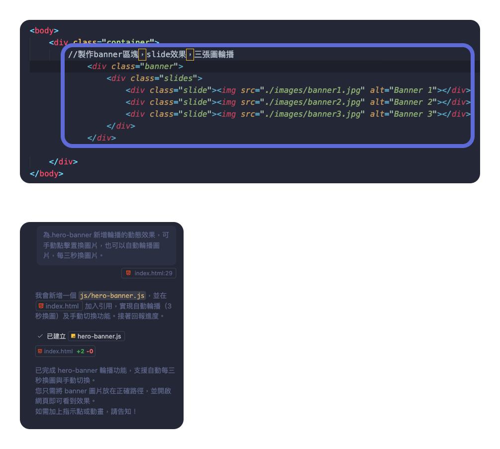 指令範本:請為.banner 新增輪播的動態效果,可手動點擊置換圖片,也可以自動輪播圖片,每三秒換圖片。