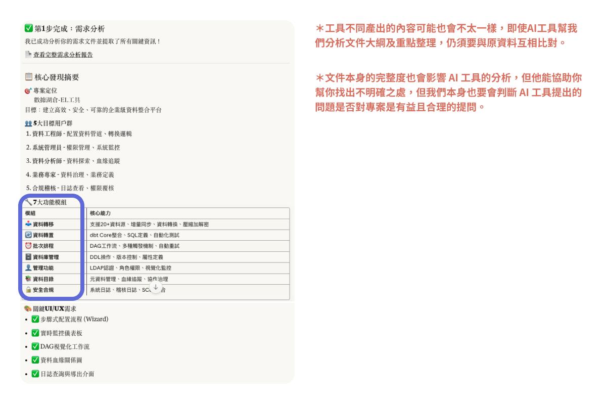 分析複雜需求文件。 提取關鍵功能清單。 找出設計問題點。 |