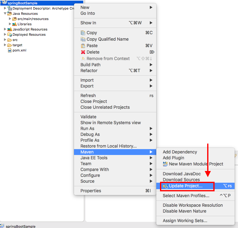 在springBootSample上按右鍵 Maven Update Project,來更新Maven Dependencies。