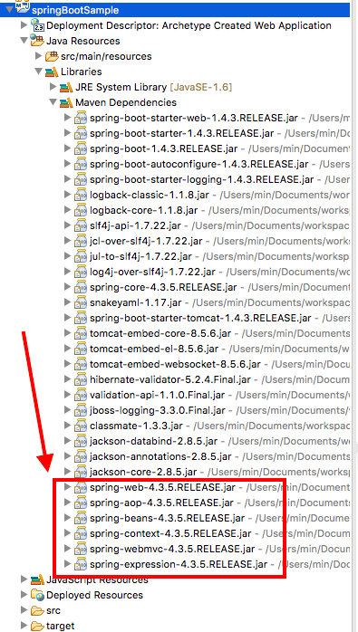 更新完後,在Maven Dependencies中,可以看到是有使用Spring framework的核心套件、log4j、embedded Tomcat…等套件。。