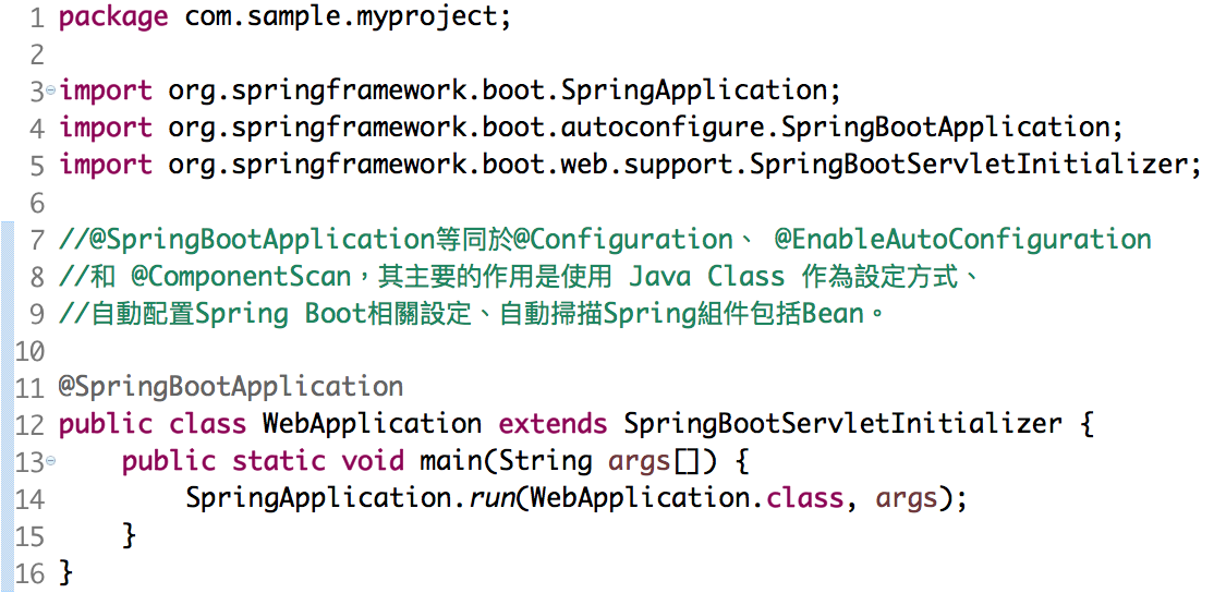 在com.sample.myproject的package下建立一個WebApplication.java檔,內容如下: